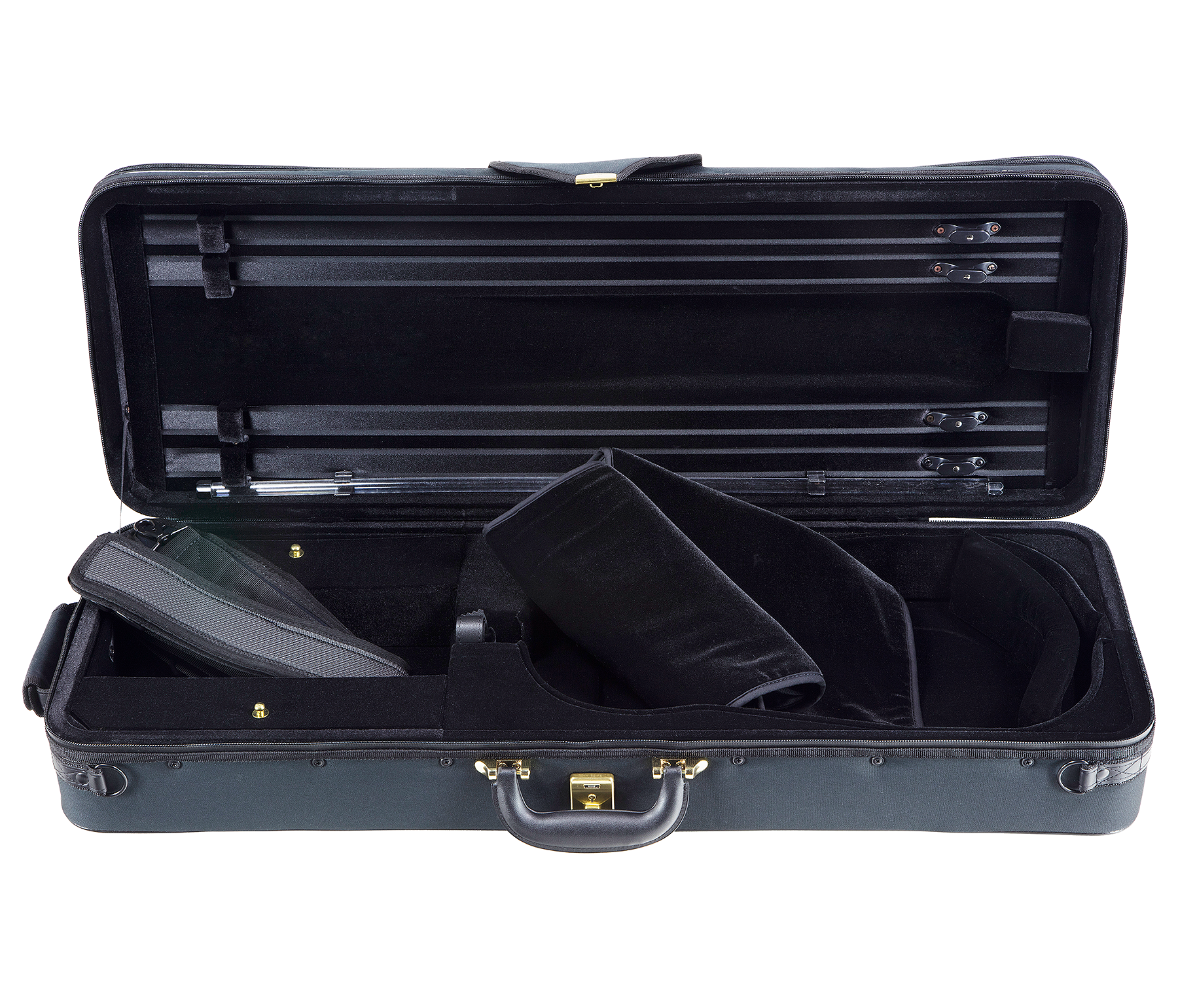 Made with core constructed of high density sytrofoam for shock absorption and thermal insulation, 450D woven rainproof fabric, YKK Aqua Guard, zipper and locks manufactured by Amiet of Switzerland, subway strap, leather handle and custom backpack straps. Exterior music pocket with extra-stretch depth for large size sheet music, 4 bow holders, blanket, neck strap, single accessory pocket and suspension system.