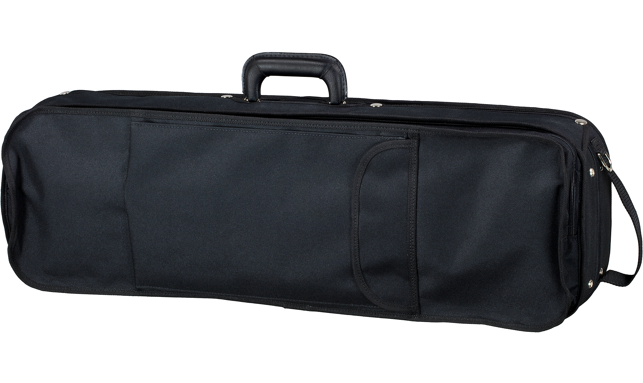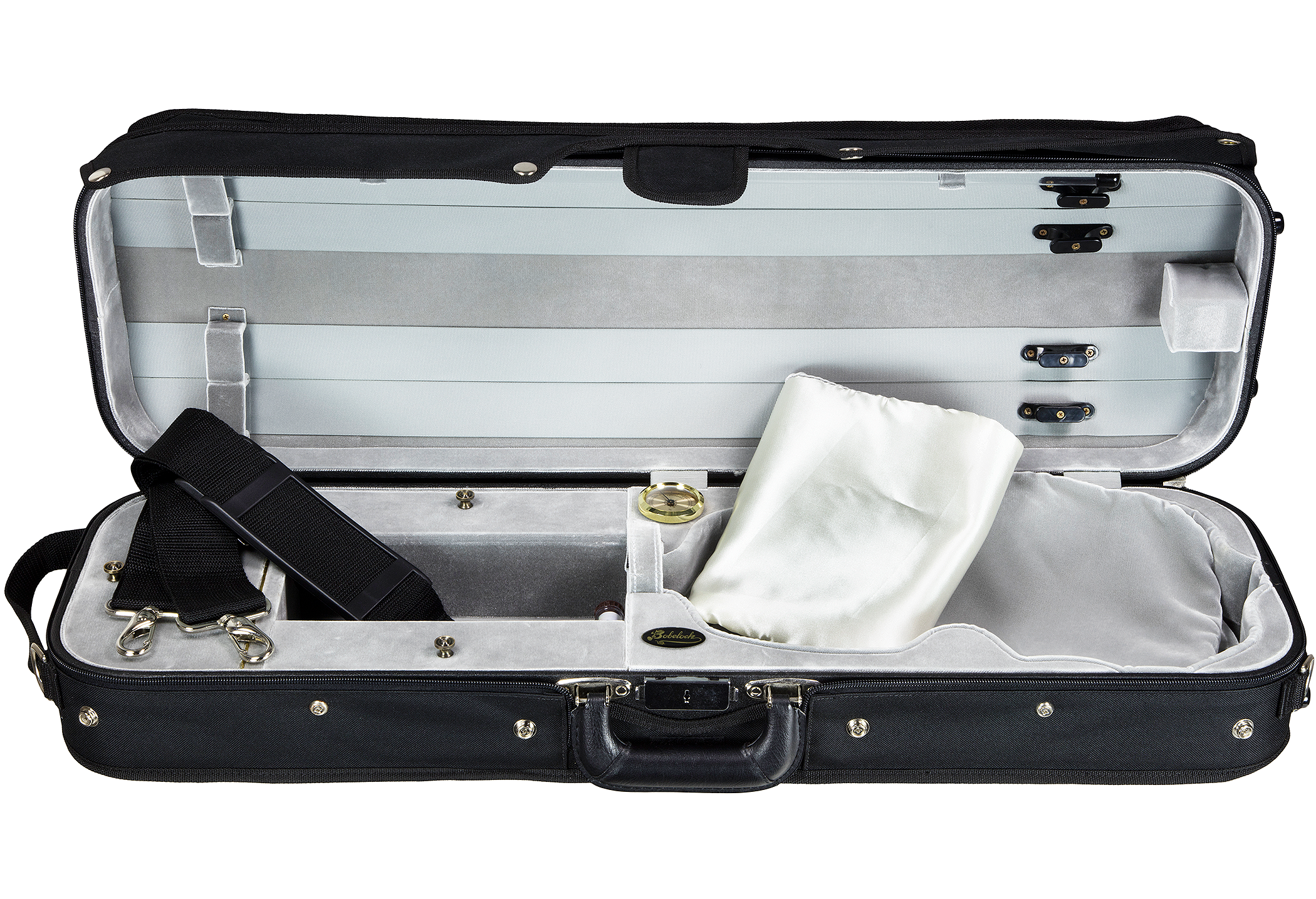Strong plywood construction, attached canvas cover, detachable backpack straps, subway handle, full length top music pocket, extra top pocket, violin suspension interior, neck strap, blanket, 4 bow holders, 3 interior accessory pockets, string tube, hygrometer, humistat.